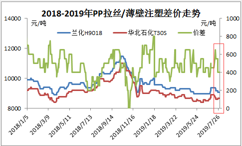 从上图可以看出,7月份,PP拉丝料/薄壁注塑料价差开始出现缩小趋势。6月底7月初,薄壁注塑料和拉丝料价差在600元/吨左右,7月底,价差缩小至400元/吨,在利润方面一直占有优势的薄壁注塑料,开始逐渐走下神坛。