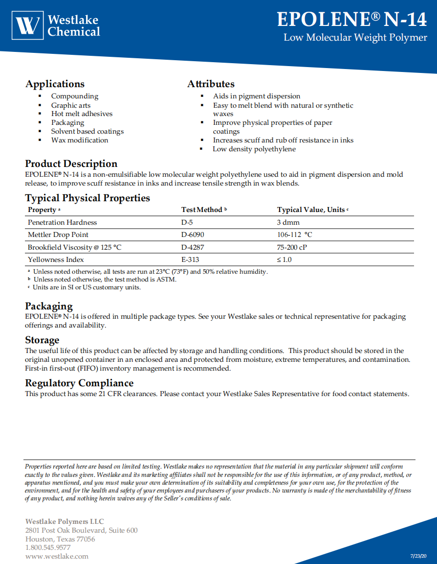 • 美国西湖化学WESTLAKEN14 聚乙烯蜡 N-14 物性表, 美国西湖化学WESTLAKEN14 聚乙烯蜡 N-14 产品参数,美国西湖化学WESTLAKEN14 聚乙烯蜡 N-14 性能表,美国西湖化学WESTLAKEN14 聚乙烯蜡 N-14 出厂报告, MSDS,, 物质安全资料表, UL黄卡,{ SGS报告, RoHS, 食品级认证, NSF饮用水标准, 产品资料, 产品性能, 出厂报告, 原厂原包, 代理商, 热变形温度, 熔指数, 流动系数, 抗冲击性能、冲击强度, 低温韧性、低温抗冲击性能, 熔体流动系数、熔体流动速率, 加工工艺、加工参数、加工温度, 欧盟RoHS 德国FDA 美国FDA 日本FDA